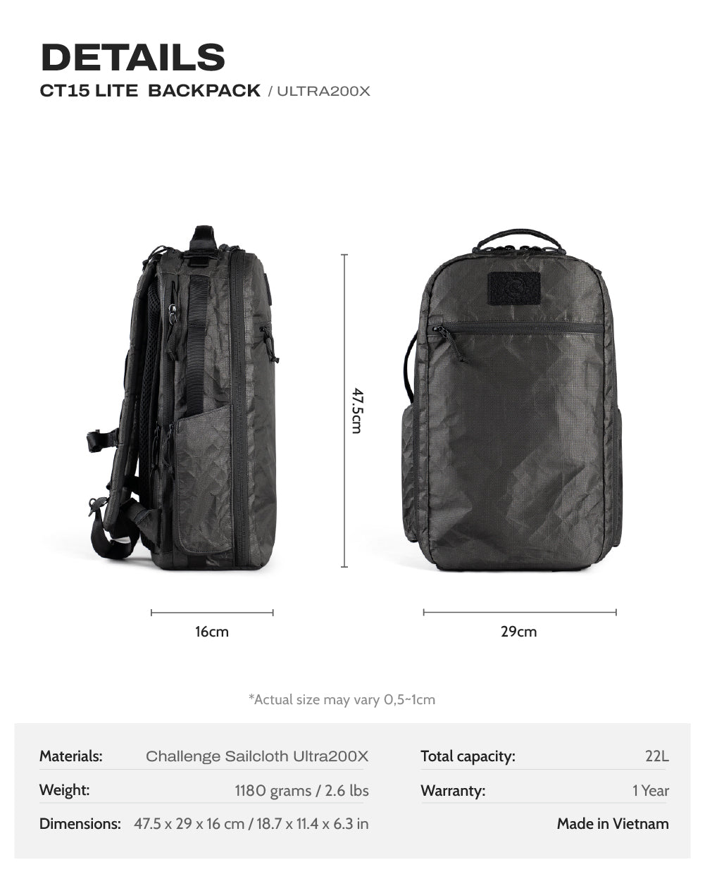 This is a simplified version called the CT15 Lite Backpack. It retains the basic functions of the original design to ensure a lightweight feel and suitability for your habit of packing your belongings into smaller pouches/accessories before packing everything and choosing the main compartment of the backpack.