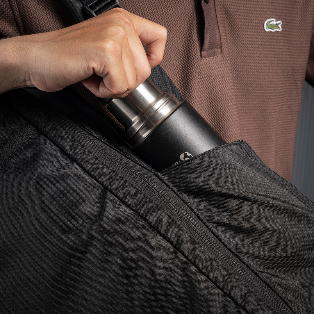 - 2 x water bottle holder compartments, stretchy material.