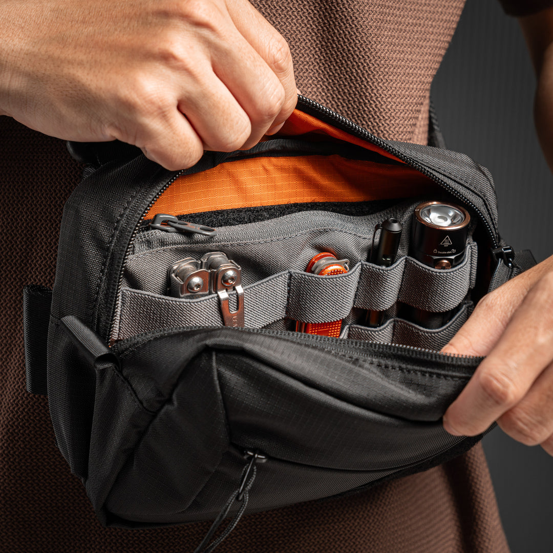 Velcro inside the main compartment is compatible with Admin Insert Gear to neatly secure EDC accessories.