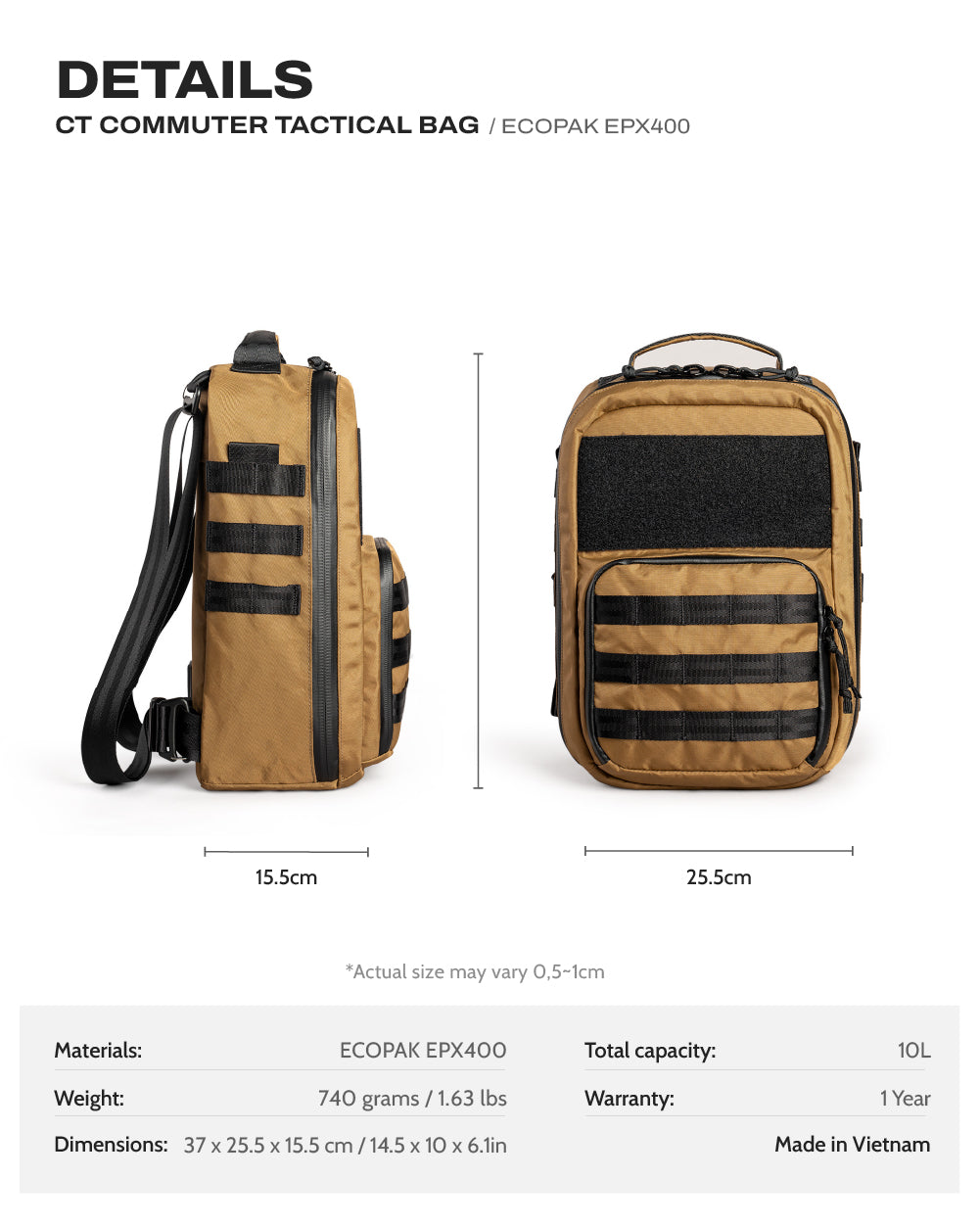 The TACTICAL STYLE version has integrated MOLLE Webbing on the front of the bag, 2 sides and admin compartment to hold EDC accessories.