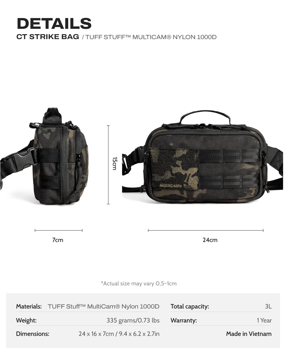 - Shell fabric: TUFF Stuff™ MultiCam® Nylon 1000D.